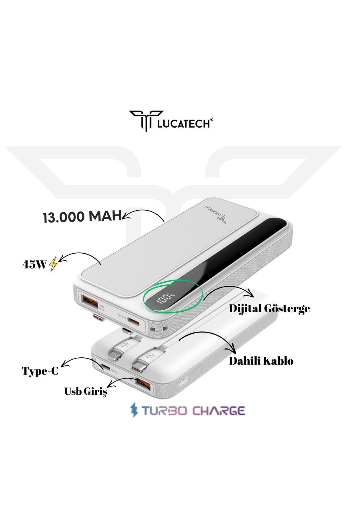 Product Description: The LP-506 13000 mAh portable power bank offers a practical and powerful solution that allows you to charge your devices quickly and reliably. Thanks to its integrated Type-C and Lightning cables, you can charge instantly without carrying additional cables, and with 45W PD fast charging support, you can quickly charge your devices to full capacity. The digital display makes it easy to monitor the charge level. Featuring both USB and PD outputs, this power bank allows you to charge multiple devices simultaneously.