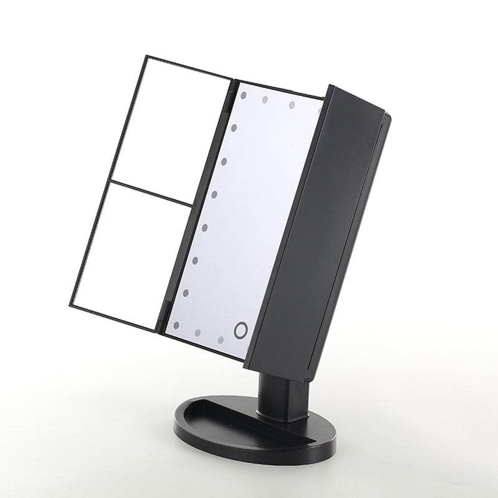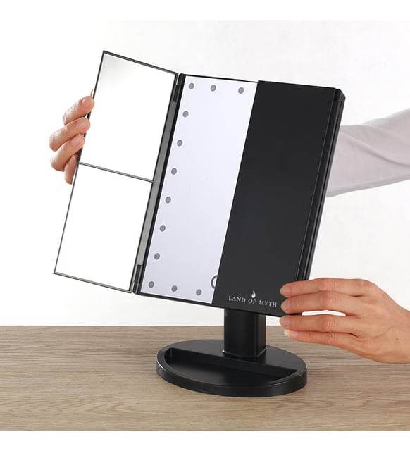 LED makeup mirror, magnifying table mirror, 1X 2X 3X magnification mirror, black LED mirror, touchscreen makeup mirror, LED lighted makeup mirror, trifold table mirror, USB charging makeup mirror, portable tabletop mirror.