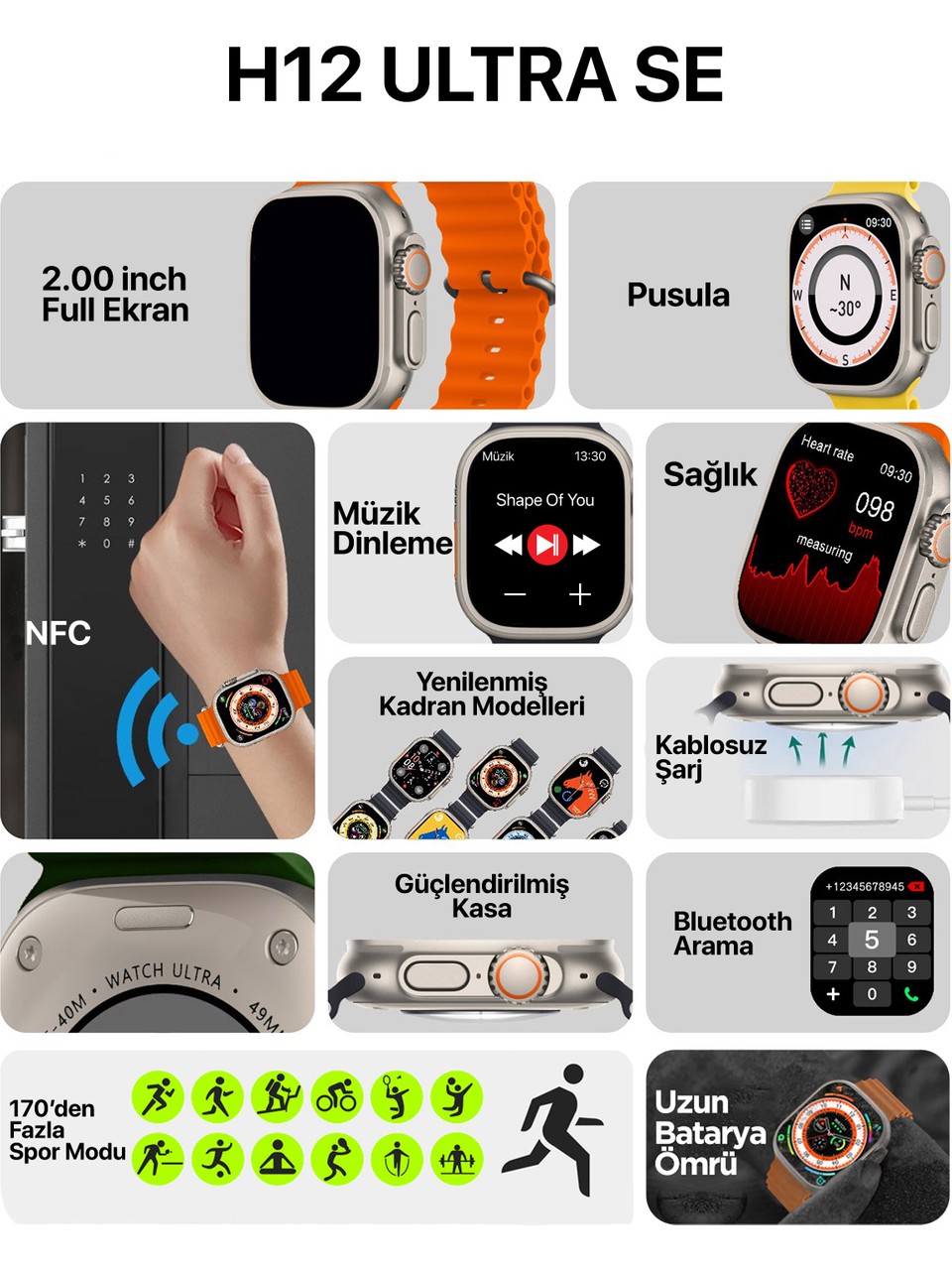 With its large screen and high-tech features, the H12 Ultra SE 49mm Smartwatch not only tells you time but also offers an experience that makes your life easier and more efficient. Advanced functions like a compass, NFC, Siri integration, and Bluetooth calling allow you to manage every moment. With its large 49mm screen, you can clearly see all your notifications and health data, and its stylish and durable design will attract attention. With its powerful features and modern look, the H12 Ultra SE stands out in the smartwatch world.